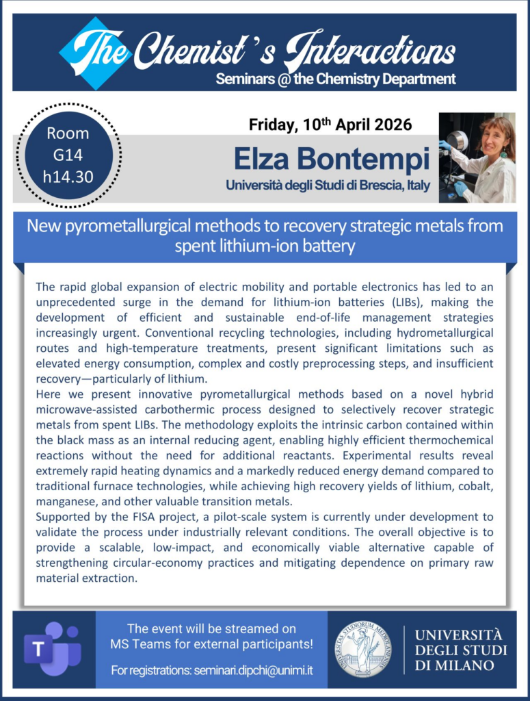 The seminar addressed the challenge of managing end-of-life lithium-ion batteries, driven by the rapid expansion of electric mobility and portable electronics. Prof. Bontempi presented innovative pyrometallurgical strategies based on hybrid microwave-assisted carbothermic processes for the selective recovery of strategic metals from spent batteries.