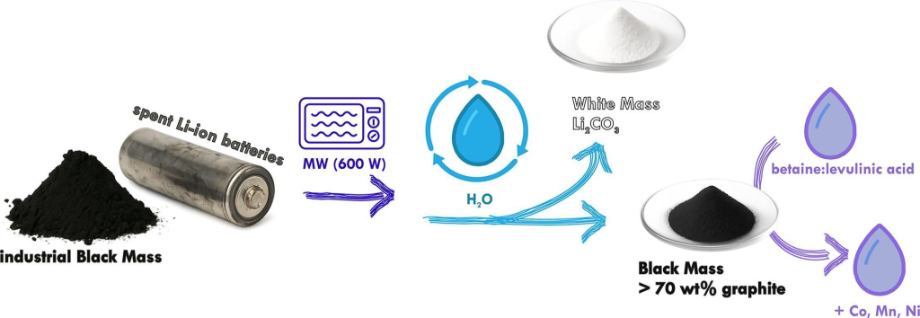 - The growing demand for lithium-ion batteries (LIBs) has intensified the need for efficient and sustainable recycling processes to recover critical metals such as lithium, cobalt, Ni, and Mn from spent batteries. This study presents a novel microwave-assisted pyrometallurgical-hydrometallurgical approach for the selective and high-yield recovery of Li and from industrial black mass (BM). The process integrates microwave-induced carbothermic reduction with a two-step leaching strategy, water leaching for Li2CO3 recovery and deep eutectic solvent (DES)-based leaching for Co, Ni, and Mn extraction. Advanced characterization techniques (SEM/EDS, ICP, XRD) confirmed the selective separation of metals. In the optimized version, the proposed process allowed up to 85% Li efficiency. A sustainability assessment using the ESCAPE index demonstrated the environmental advantages of this method over conventional acid-based hydrometallurgy. This scalable and eco-friendly process offers a suitable pathway for Li recovering from spent LIBs, aligning with circular economy principles and future industrial implementation.